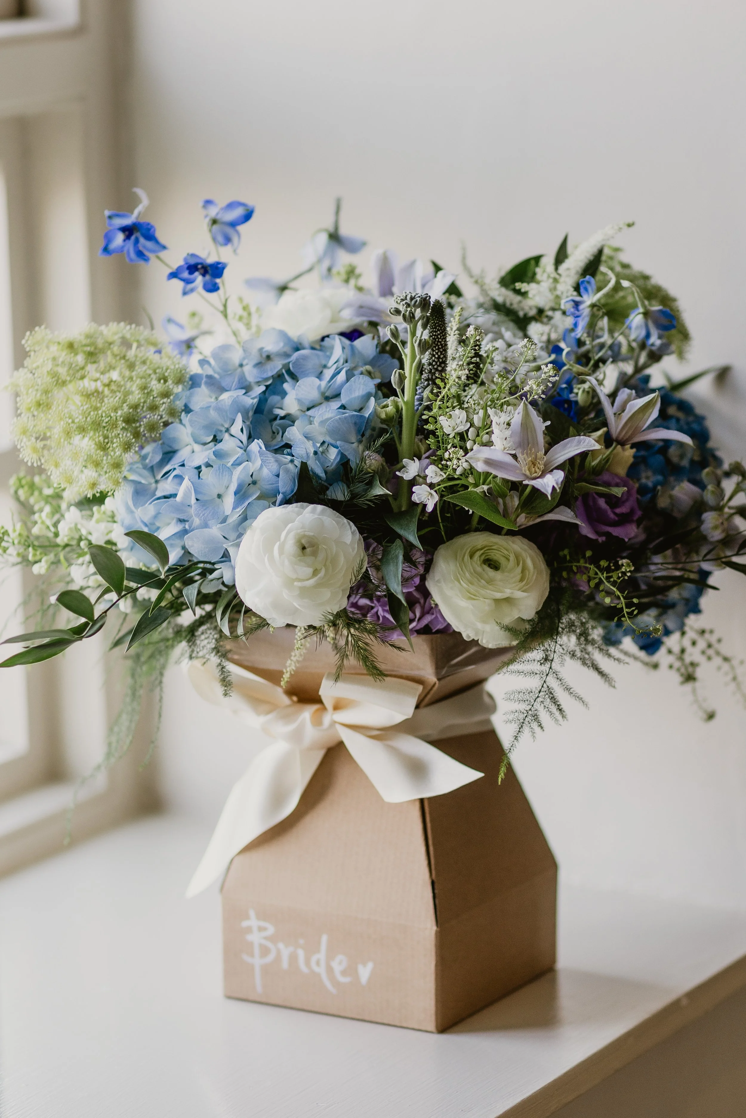 Megan from Rooted Up North did an amazing job with the florals, matching them to the colours of Amy’s dress. She created a perfect spring palette of blues and lilacs. Colour is definitely in this year and I’m here for it. A blue hydrangea wedding dress with matching hydrangeas in the bouquets and centre pieces. Just dreamy. Megan is undeniably talented.