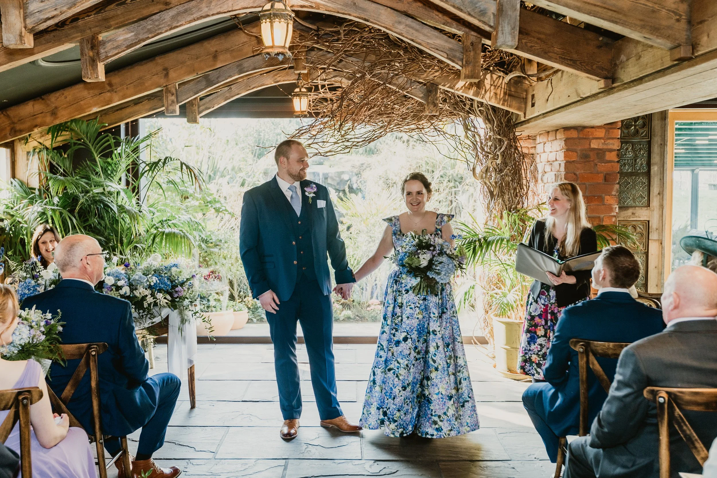 A beautiful, early spring day with blue skies to match Amy’s blue wedding dress. This alternative wedding dress was definitely a win! It was the inspiration for everything from the cake to the flowers. Even the name cards and table numbers matched. And to go one further, her blue Doc Martins were a unique choice of footwear that meant no change of shoes for the Bride was needed!
